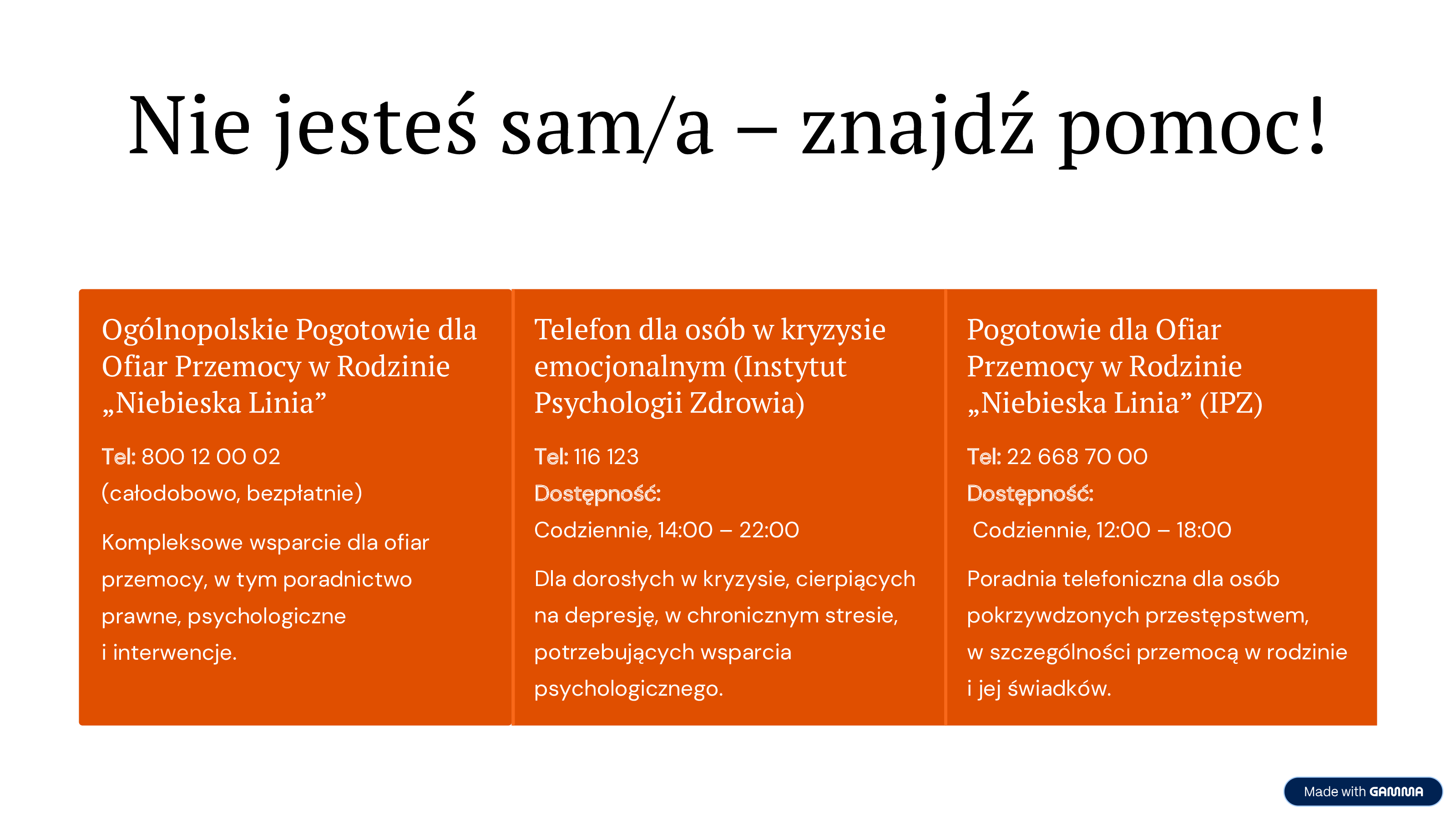 - Telefon interwencyjny dla kobiet doświadczających przemocy: 600 070 717