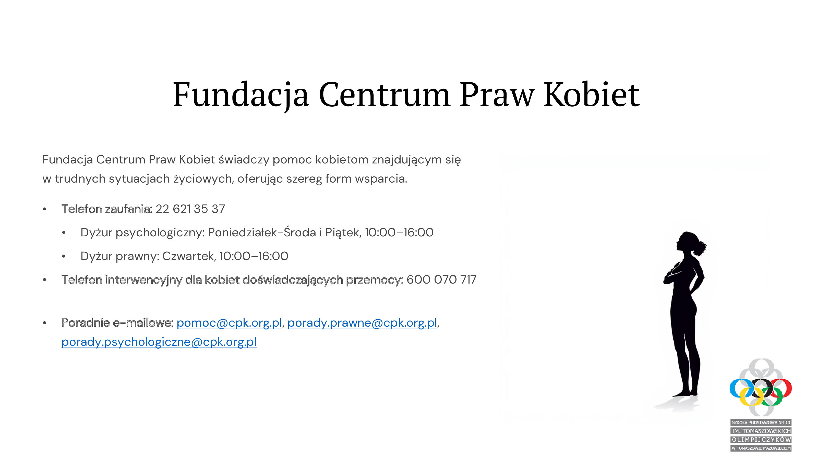 - Poradnie e-mailowe:pomoc@cpk.org.pl, prawne@cpk.org.pl, porady.psychologiczne@cpk.org.pl