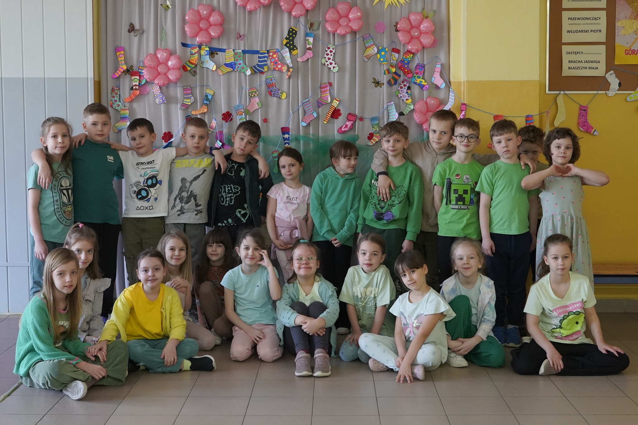 Dodatkowo uczniowie innych klas zaangażowali się w obchody tego wyjątkowego dnia ubierając kolorowe skarpetki i przygotowując kolorowe skarpetki – symbol solidarności z osobami z zespołem Downa. Z wykonanych prac powstała piękna dekoracja na szkolnym korytarzu.