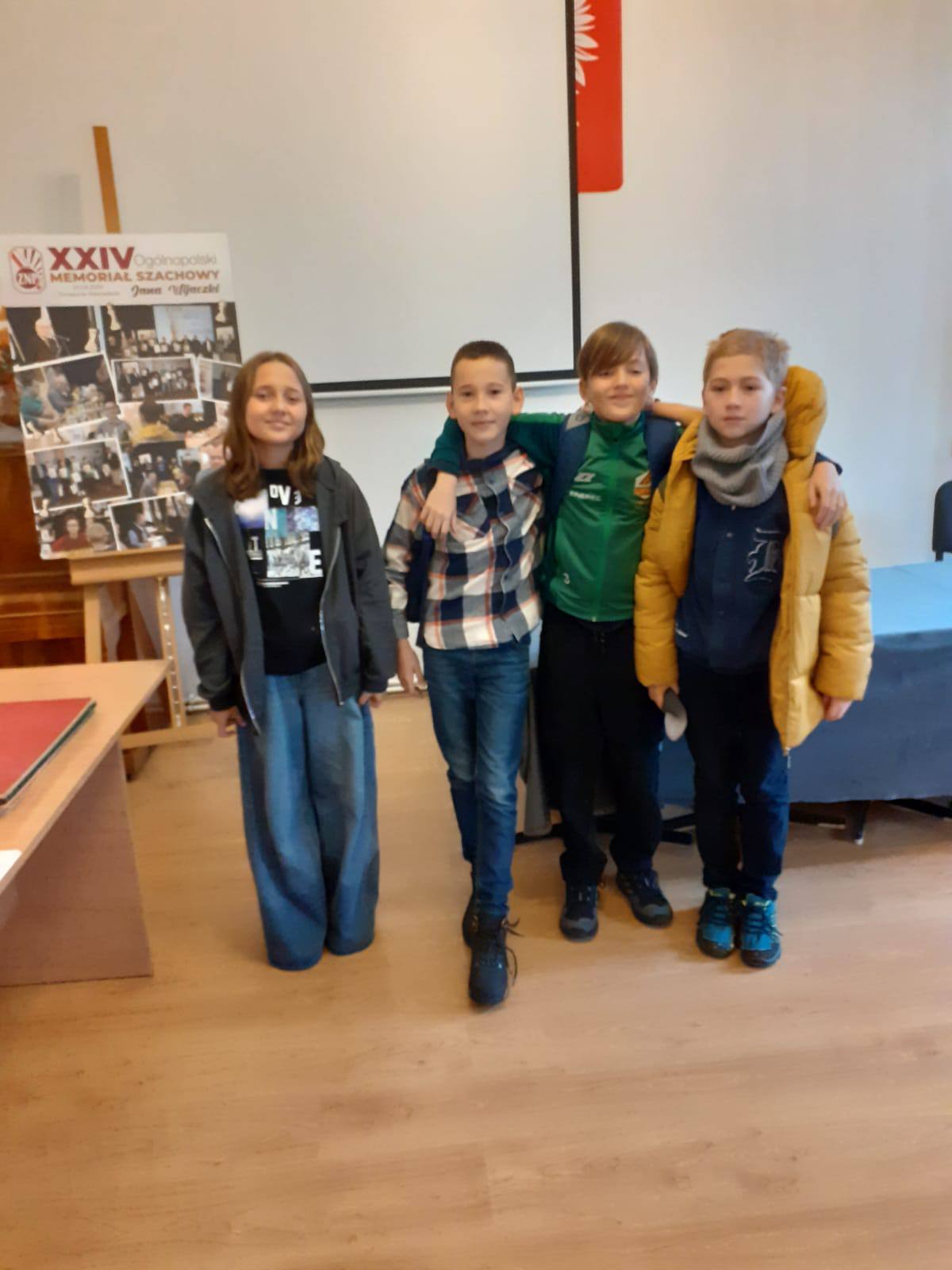Szymon Barański, Dmytro Druchyk, Bartłomiej Idzikowski i Aleksandra Malinowska, wszyscy z klasy 4s, rozegrali wiele emocjonujących partii pod czujnym okiem sędziego zawodów Pana Grzegorza Wągrodzkiego. W swoim debiucie, wśród wielu starszych uczestników, zajęli czwarte miejsce. Gratulujemy i zachęcamy do ćwiczenia tej królewskiej gry.