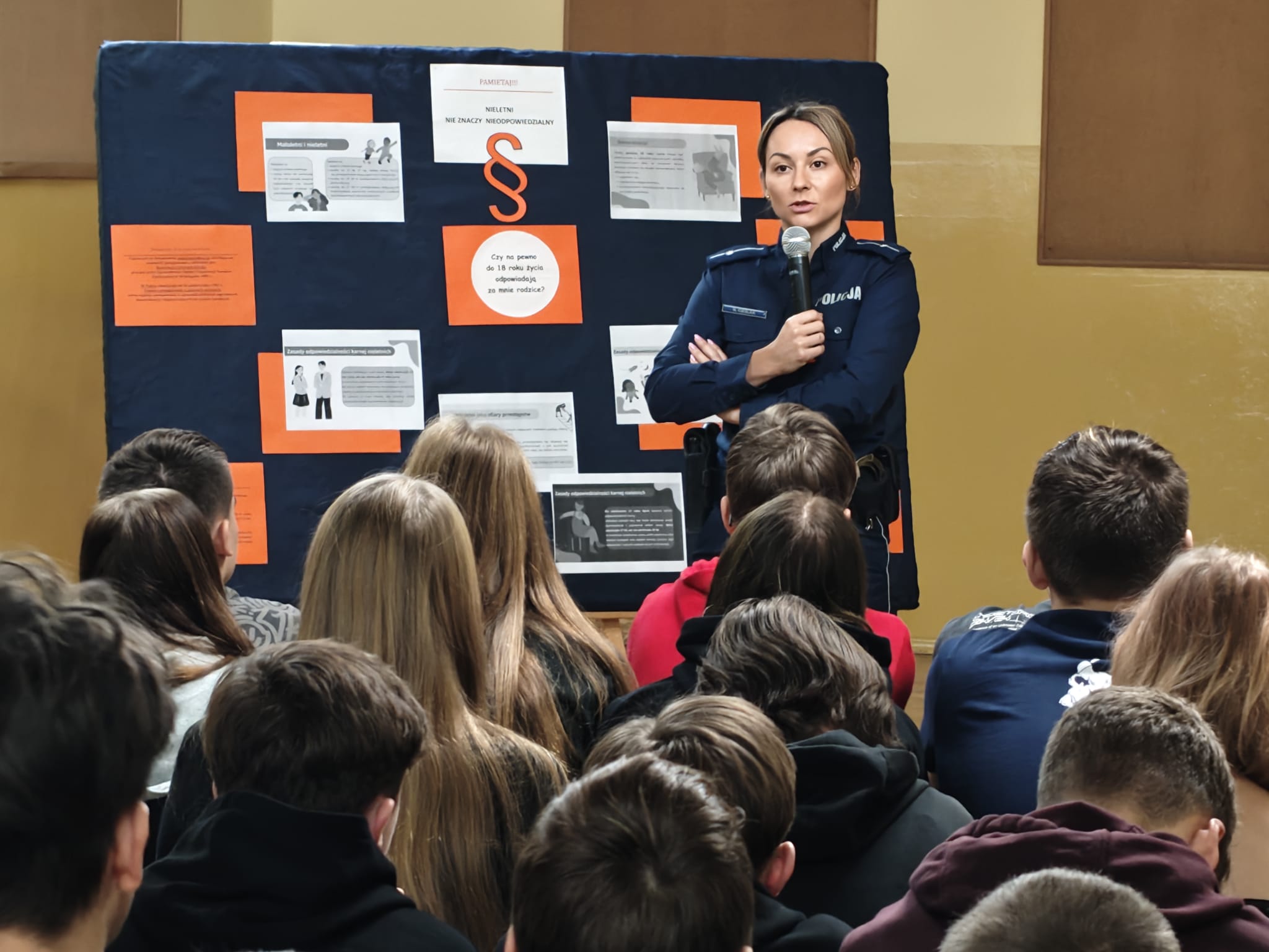 Tematem rozmowy była odpowiedzialność prawna nieletnich za czyny karalne i wykroczenia. Młodzież dowiedziała się, że takie zachowania jak wandalizm, niszczenie mienia szkoły, palenie e-papierosów, stosowanie używek, wagary, nierealizowanie obowiązku szkolnego, przemoc i cyberprzemoc mogą prowadzić do poważnych konsekwencji prawnych i świadczą o demoralizacji.