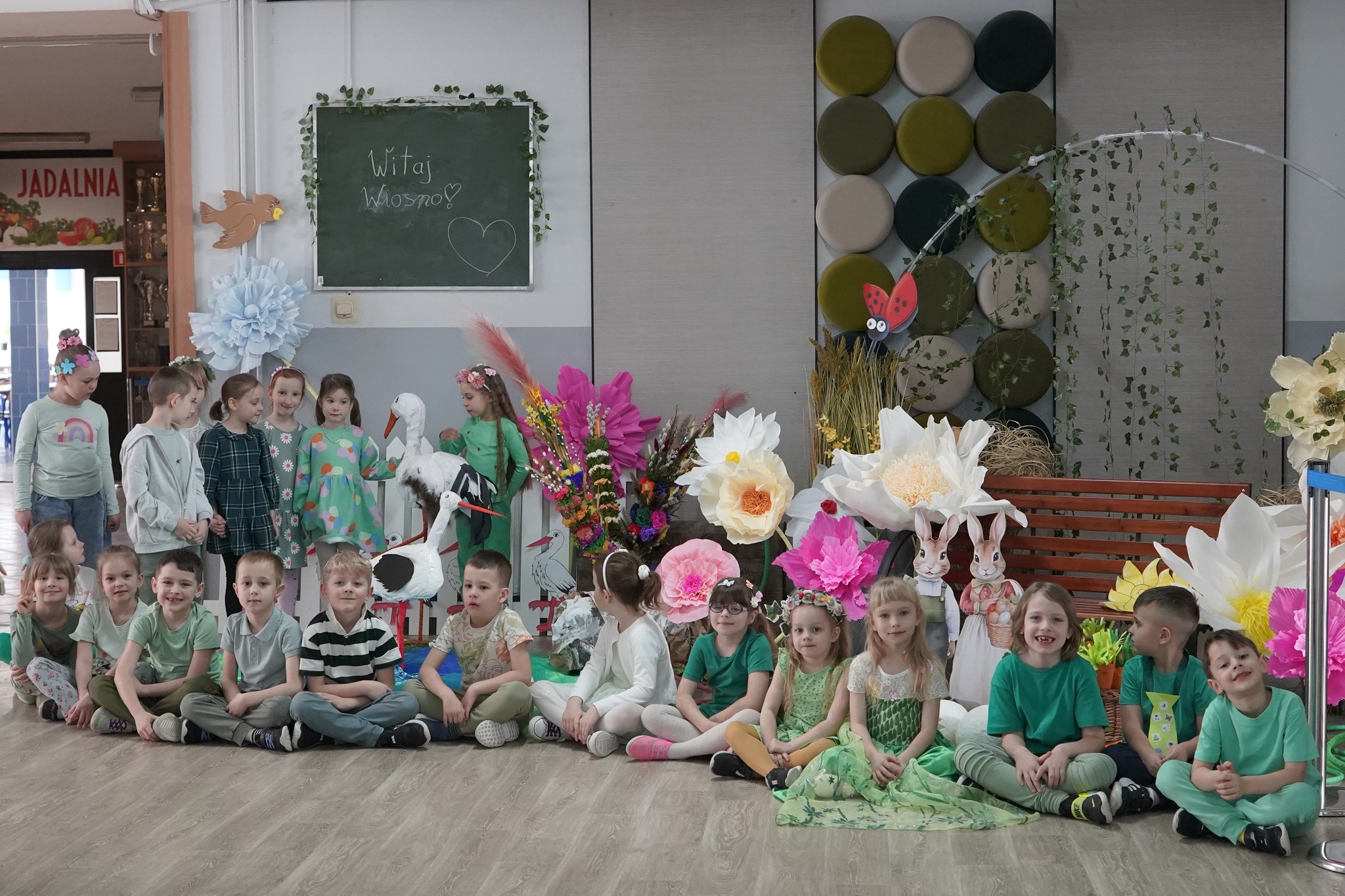 Dzięki niezwykłemu talentowi p. Anny Modelskiej nasz korytarz zamienił się w prawdziwą, kolorową krainę. Pojawiły się bociany, kwiatowe instalacje, wiosenna ławeczka, a także subtelny akcent wielkanocny, który pięknie dopełnił całość dekoracji. To miejsce, obok którego nie da się przejść obojętnie.